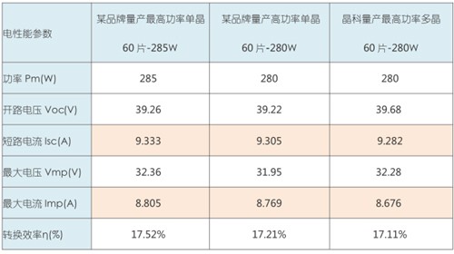 下一页>从电性能参数列表可以看出,同档位组件(280W),某品牌-单晶较晶科-多晶具有更高的Is(高0.05A,0.25%)c和Imp0.05A(高0.09A,1.08%);更高档位的某品牌-单晶-285W与晶科-多晶-280W的Isc(高0.05A,0.55%)和Imp(高0.13A,1.50%)差值更大。因而,户外发电时,晶科-多晶产品较某品牌-单晶产品具有更低的线路损耗和工作温度,实际发电损失更小,发电性能更优。