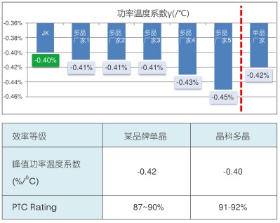 以某品牌和晶科单多晶为例,某品牌单晶的功率温度系数是-0.42%/摄氏度,晶科多晶是-0.40%/摄氏度,也就是说在25度以上,温度每上升一度,某品牌组件下降0.42%功率,而晶科多晶下降-0.40%功率。而根据PTC值,在野外实际工作环境下,同样功率的组件,多晶的实际发电效能要高于单晶。