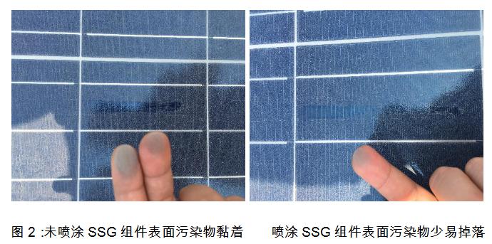 采用SSG膜层的光伏组件可以有效缓解上述问题。在自然光的照射下,SSG膜层可以在不发生自身损耗的情况下,通过光催化性能分解表面的有机污染物,降低积尘的粘性,从而大大缓解城市污染对于光伏电站系统效率的负面影响。目前,通过在北京和山东城市屋顶光伏电站以及靠近化工厂的地面光伏电站使用情况来看,使用SSG膜层的光伏方阵同比增发(比不使用的光伏方阵)5%以上,应用效果明显(如图2)。
