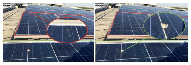 此外,鸟粪这类污染物对于光伏电站来说一直是一个老大难问题,鸟粪不但污染组件表面,降低电站效率,还有可能造成组件热斑,严重的可以引起光伏电站火灾。