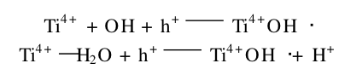 这些电子-空穴对迁移到表面后,可以参加氧化还原反应,加快光降解反应。这些反应包括:所产生的电子-空穴可将吸附在二氧化钛颗粒表面的羟基和水分子氧化为OH-自由基: