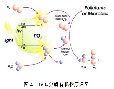 缔合在四价钛离子表面的OH-自由基为强氧化剂,能够氧化相邻的有机物,也可以扩散到液相中氧化有机物。许多有机物也可被空穴所氧化。吸附在二氧化钛表面的氧气可以通过捕获电子,形成过氧负离子而阻止电子与空穴的复合,继而提高其氧化反应活性: