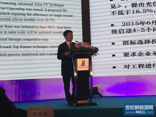 我们在2015年开始做了一个事情,就是中国的光伏发电虽然说规模比较大的,但是我们还必须关注技术进步,所以我们要加速技术进步,所以启用了光伏领跑计划,我们是发布了光伏技术产品应用和产业升级的意见,提出光伏领跑计划,要求多晶硅的组件转化效率要到于16.5%,单晶硅这个光伏组件的效率高于17%,简单来说就是要比普通的产品高1个百分点。2015年已经在山西的大同,在一个产煤沉陷区域,地表遭到了一定的沉降破坏,利用这个地面来建设大同的光伏基地,这个基地总的规划是3GW,它的第一期启动了1个GW,一共是15个项目,1个GW,预计今年的年中6月份、7月份全部建成。