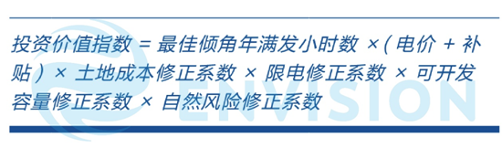 投资价值指数反映了在一个地区进行集中式电站投资时在考虑风险因素后的收益预期。从指数的计算上看,指数的基础是:等效发电小时数 × 电价和补贴,反映了发电量的收益。在此基础上,通过限电、土地、可开发容量、自然风险等参数进行修正,以反映不同风险情况下,投资收益预期的折减情况。同时还根据不同地区独有的情况,对敏感性影响因素予以额外修正。最后将指数进行归一化处理,以方便对不同地区进行横向比较。