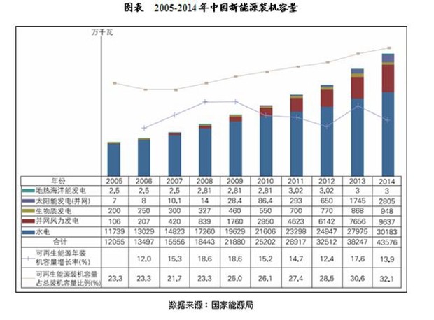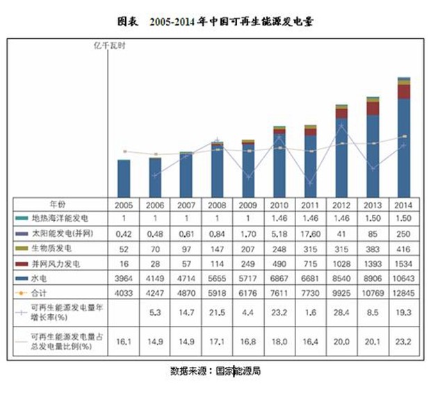 可再生能源发电总装机容量从2010年的2.54亿千瓦增加到2014年底的4.36亿千瓦,在全国总发电装机中的比重从2010年的26.0%增加到2014年的32.0%;2014年可再生能源总发电量比2010年增长近一倍,在全部发电量中的比重也从2010年的18%增加到2014年的23.2%,其中水电增加了3.1个百分点,风电增加了1.6个百分点。风电、太阳能发电在内蒙古、甘肃、青海等地发电量中的比重均超过了10%,成为当地重要的新增电源。