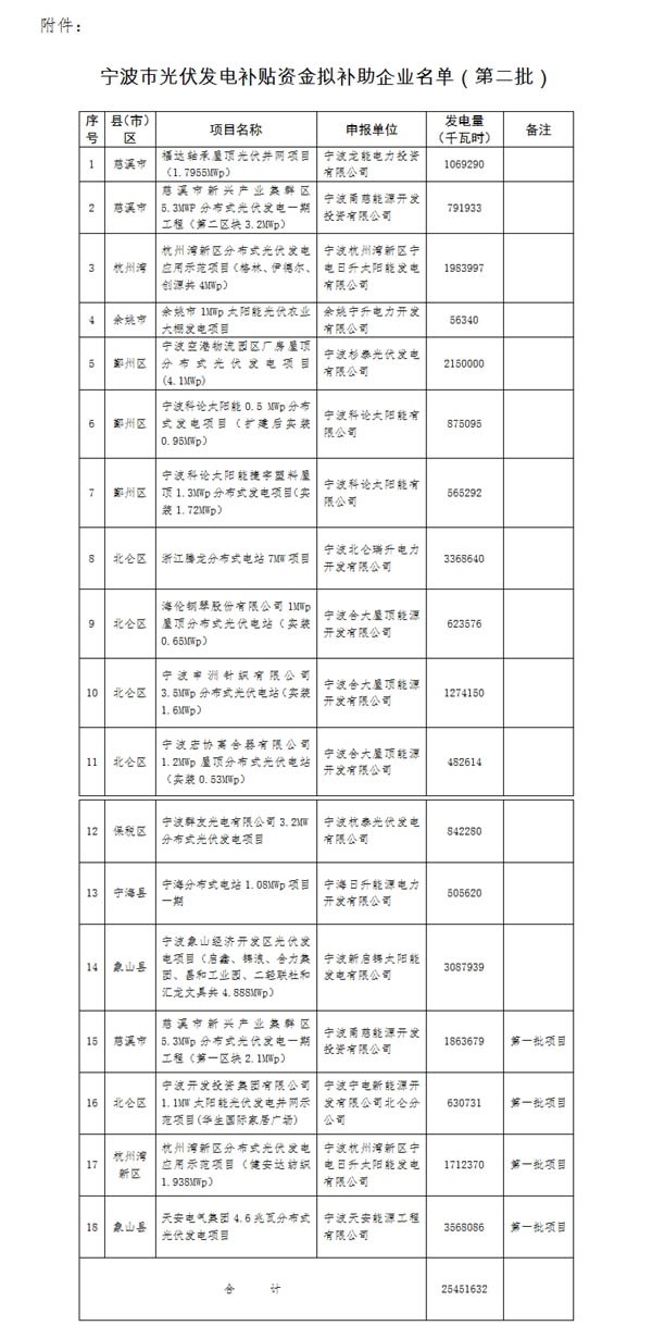 附件:宁波市光伏发电补贴资金拟补助企业名单(第二批)