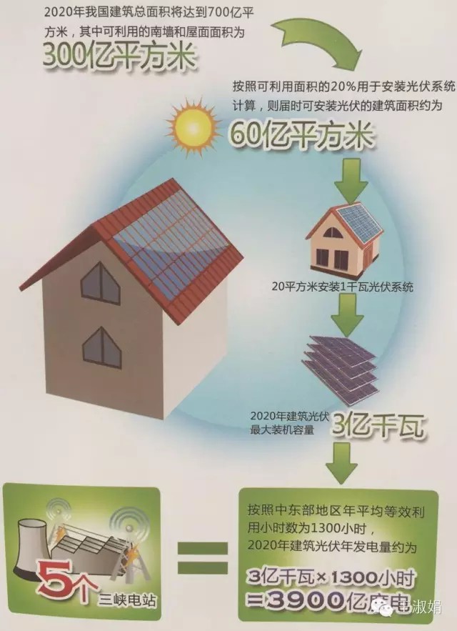 按照国家住宅与居住环境工程技术研究中心推算数据,2020年我国建筑总面积将达到700亿平方米,其中可利用的南墙和屋面面积为300亿平方米,按照可利用面积的20%用于安装光伏系统计算,则届时可安装光伏系统的面积约为60亿平方米。根据每20平方米安装1kW光伏系统计算,2020年建筑光伏系统最大装机容量可高达3亿kW。由于80%的屋面面积位于我国中东部地区,因此建筑光伏的主要建设区域在中东部地区。按照中东部地区平均年等效利用小时数为1300h,2020年建筑光伏年发电量约为: