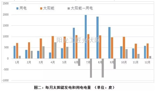 安装7.2千瓦的屋顶太阳能电板,全年发电量约为10938度,扣除电池的550度电能损耗后,可满足用户的全年用电需求。太阳能电板的月输出电量见上面的图二。
