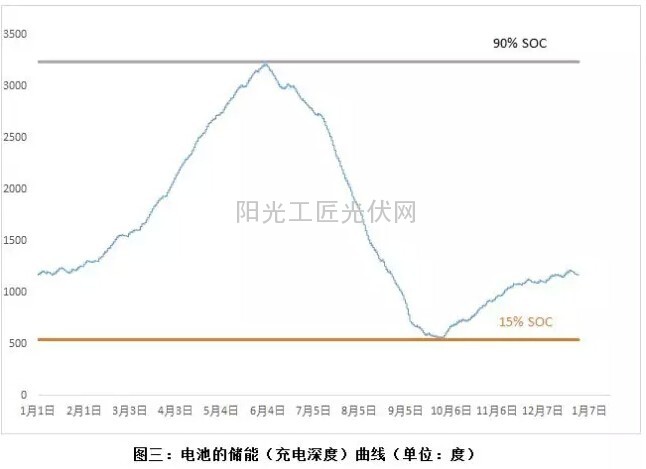 电池的年充电深度曲线见图三,在夏季高峰前,电池的储能达到最高峰3220度(89.5%充电深度),在夏季结束后,电池储能降为550度(15.3%充电深度),等待秋、冬、春的三个充电季节的来临。