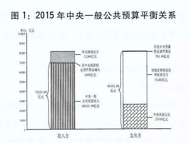 中央一般公共预算收入69233.99亿元,为预算的100%,增长7%。加上从中央预算稳定调节基金调入1000亿元,收入总量为70233.99亿元。中央一般公共预算支出80730亿元(其中,中央本级支出25549亿元,中央对地方税收返还和转移支付55181亿元),完成预算的99.1%,增长8.6%。加上补充中央预算稳定调节基金703.99亿元,支出总量为81433.99亿元。收支总量相抵,中央财政赤字11200亿元,与预算持平。2015年末,中央财政国债余额106599.59亿元,控制在年度预算限额111908.35亿元以内;中央预算稳定调节基金余额1156.37亿元。