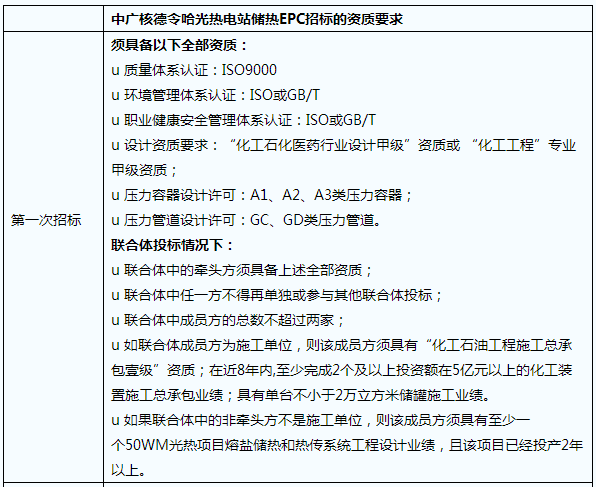 中广核德令哈光热电站储热EPC于2015年6月17日首次开标,共有包括太原赛鼎工程有限公司(简称赛鼎工程)、东华工程科技有限公司(简称东华工程)、华陆工程科技公司(简称华陆工程)、中国昆仑工程公司(简称昆仑工程)、中国天辰工程公司(简称天辰工程)、三维工程六家投标方参与。这六家投标方多脱胎于原化工部九大设计院,其中赛鼎工程为原化工部第二设计院、东华工程为第三设计院、华陆工程为第六设计院、天辰工程为第一设计院。而昆仑工程则为中国纺织工业设计院与大庆石化工程有限公司、中石油工程设计有限公司辽阳分公司重组成立的,三维工程为齐鲁石化胜利炼油设计院改制公司。