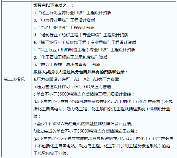 原因在于第二次招标放宽了对投标方的资质要求,使得拥有电力行业工程设计资质的各电力设计院满足了投标要求。下表列出了两次招标对投标资格要求的不同之处。