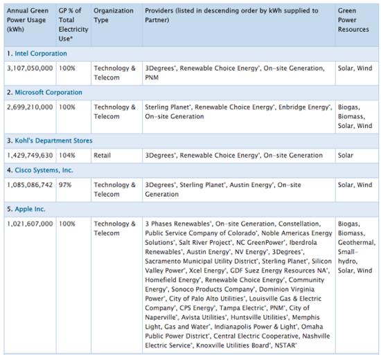 根据美国环境保护署的百名绿色能源企业榜单(上图为前五截图),我们发现英特尔高居榜首、微软第二、思科第四、苹果才排到第五。