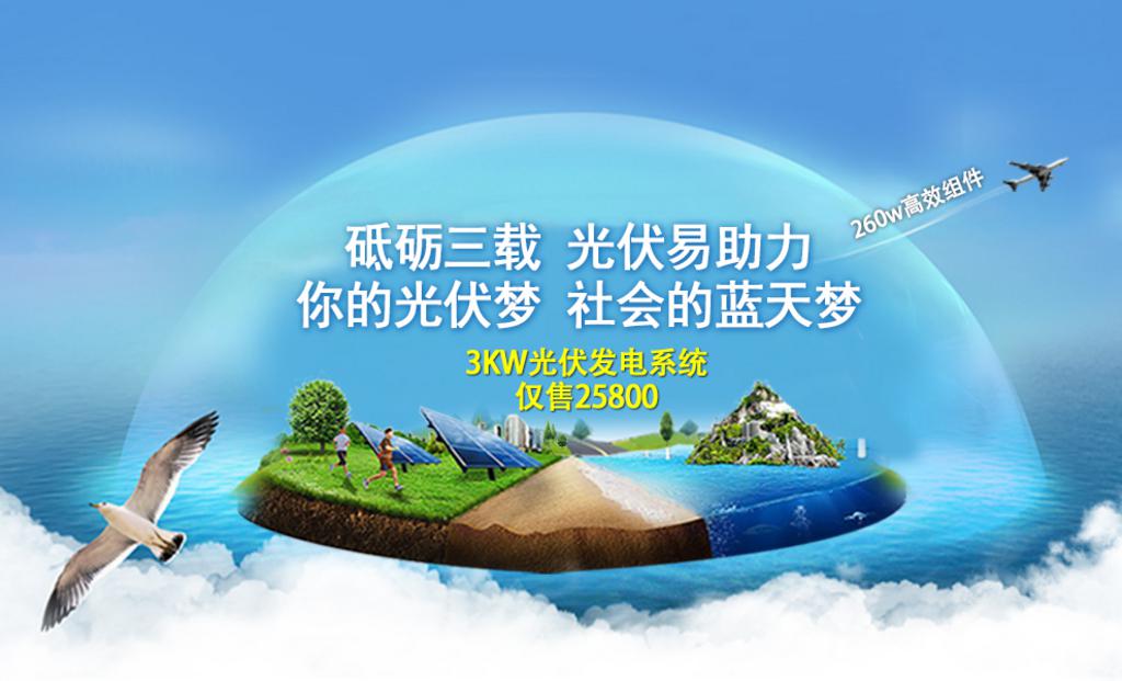 为庆祝光伏易成立三周年,现在起,只需要25800元就可以用上家庭太阳能光伏电站!享受最清洁环保的电,不用交电费,每个月还可以拿补贴。电站装机容量3KW,全部采用260W高效太阳能光伏组件,有效节省安装空间,光电转换率更高。光伏易将提供从设计安装、并网支持到运营维护的一站式服务,免费质保25年,助力千家万户轻松实现“光伏梦”。