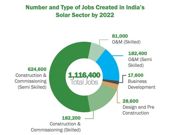 报告中认为,工程师、建筑和运维工人将是重要组成部分。预计到2022年,规模型太阳能和屋顶太阳能系统行业的工程师和项目设计师岗位缺口达21.08万;建筑和现场施工的半熟练工人缺口则达到62.46万;负责太阳能电站运营监测和维护的半熟练工人缺口约18.24万。以此累计,到2022年,印度实现太阳能在营装机容量100吉瓦的计划将为当地创造101.78万个工作岗位。