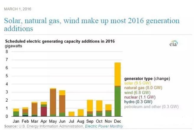 美国电力供应商预计2016年新增装机容量将达到26万千瓦(GW),93%来自可再生能源,其中包括9.5GW的太阳能发电,8GW的天然气发电和6.8GW的风电。