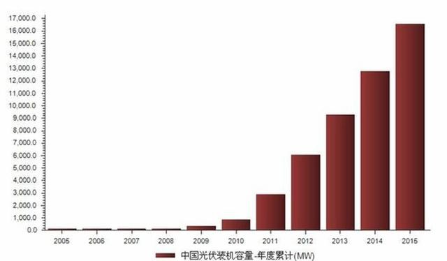 从2004年开始的0.063GW到2014年的26.84GW,10年400多倍的增长速率让全球见证了光伏发电的中国速度。2015年底,我国光伏发电累计装机容量43吉瓦,成为全球光伏发电装机容量最大的国家。
