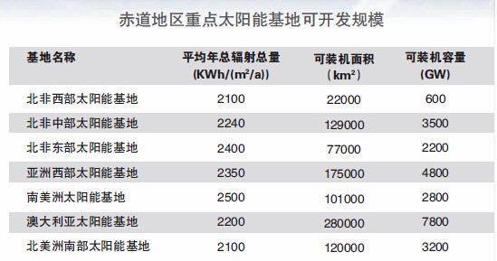 赤道地区的太阳能资源一类地区主要包括北非、东非、南非、西亚、澳大利亚、南美洲西部的广大地区,年辐照强度在2100千瓦˙时/平方米及以上,人口密度低,可利用面积大,开发潜力大,是全球太阳能基地开发的重点地区。赤道重点地区太阳能资源技术可开发量合计约936000TWh/a。