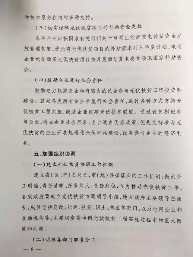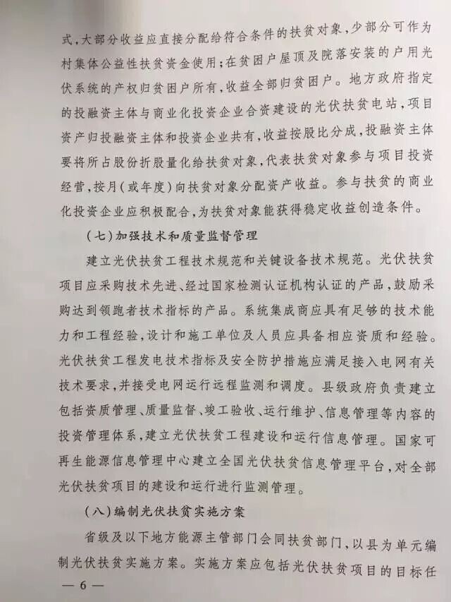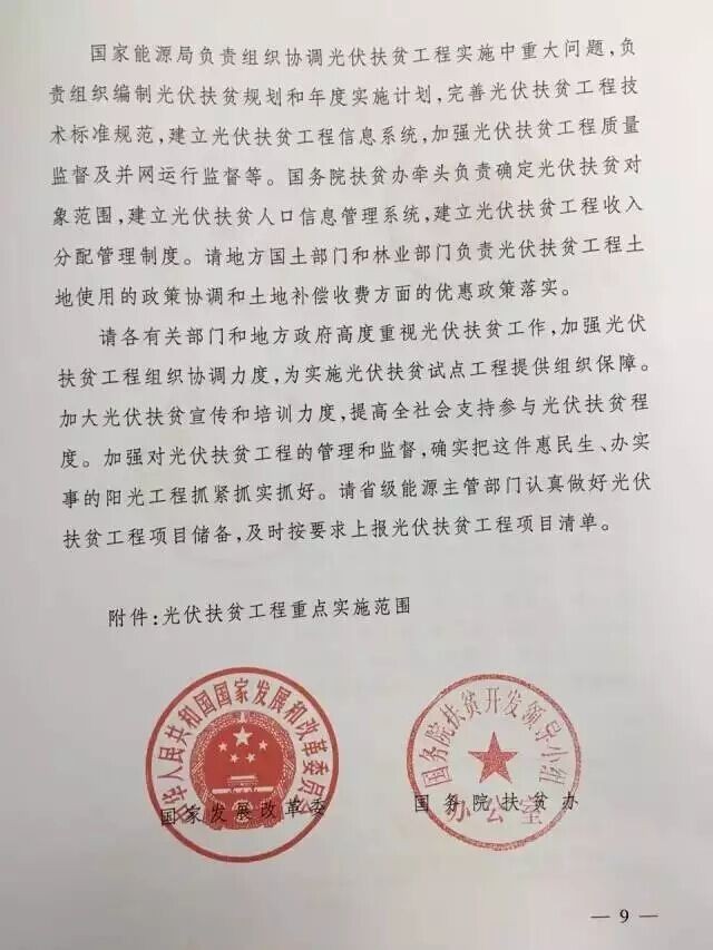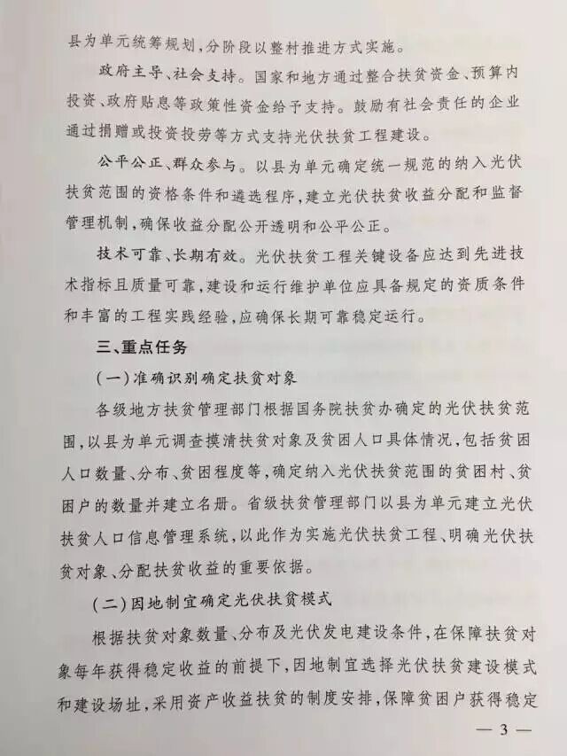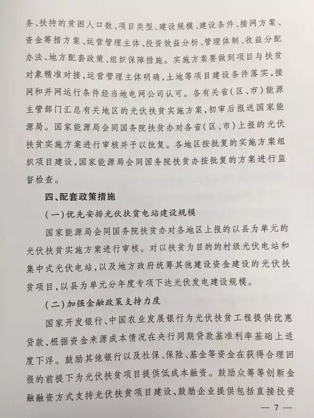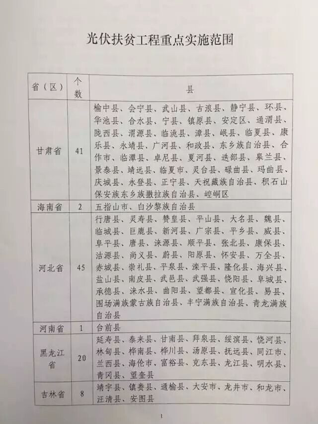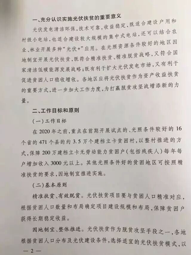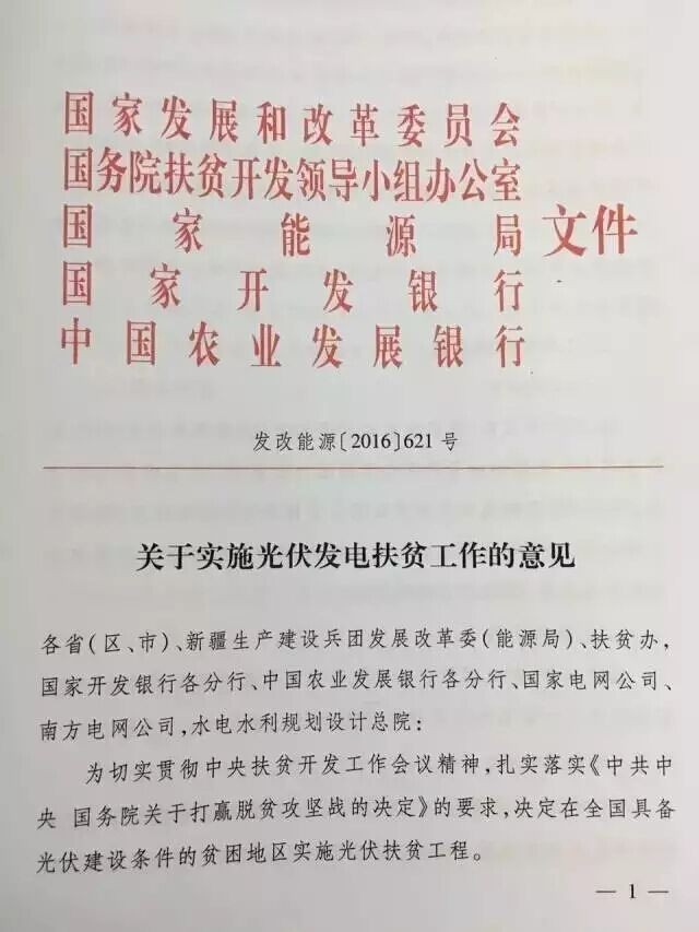 据悉,国家发改委、国务院扶贫开发领导小组办公室、国家能源局、国开行以及中国农业发展银行五部委联合下发《关于实施光伏发电扶贫工作的意见》。意见指出,要在2020年之前,重点在前期开展试点的、光照条件好的16个省的471个县的约3.5万个建档立卡贫困村,以整村推进的方式 ,保障200万建档立卡无劳动能力贫困户(包括残疾人)每年每户增加收入3000元以上。
