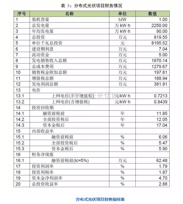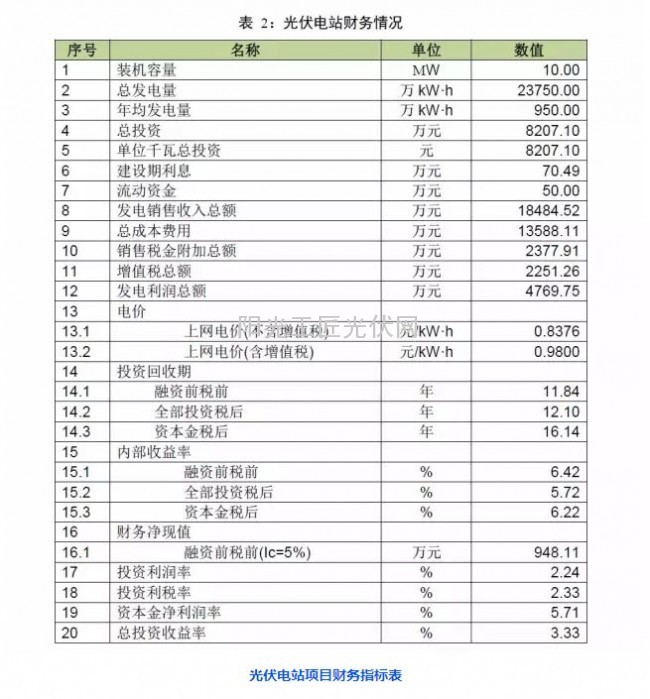 江苏对应的光伏标杆电价为0.98元/kWh,假设项目装机容量为10MW,单位造价8000元,依据以上条件测算,年满发小时数在950h左右,依据以上条件测算,项目融资前税前收益率在6.42%之间,投资回收期在11年之间,项目不具备投资条件,具体见下表。到单位造价降到7100元左右时,项目融资前税前收益率可达到8%,满足投资要求。