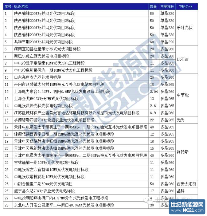 记者了解,本批招标共有31个项目,本次公布的为其中28个。值得注意的是,乐叶光伏独揽本次260MW高效单晶组件合约。