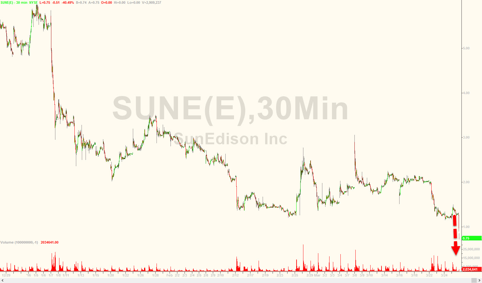 今年1月初,SunEdison股价就曾单日暴跌40%,因该公司宣布了债务重组计划。
