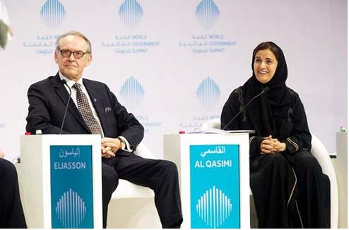 图3:UAE国际合作开发大臣H.E.Sheikha Lubna bint Khalid Al Qasimi(右侧为AlQasimi,左侧为联合国副秘书长埃利亚松。照片:世界政府峰会)