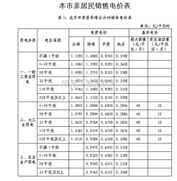 2015年北京市发改委公布的北京市非居民销售电价表