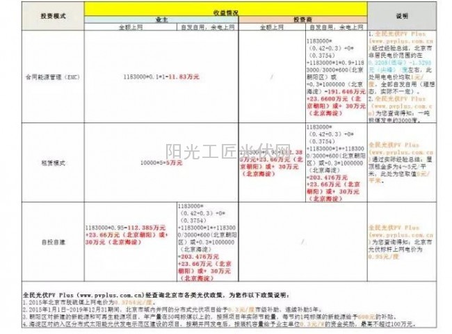 实际电价请参考用户实际电费结算单和相关发票,此表数据仅供参考 若您在北京市有一面积为1万平米的工商业屋顶(电价可参考上表),则其装机容量或为1MW,年发电量或为118.3万度(中间过程取值均为估算值,因此与实际情况或有出入。如需针对具体项目进行精准设计、测算,可联系全民光伏PV Plus为您提供免费开发顾问服务),则您的收益可能为:
