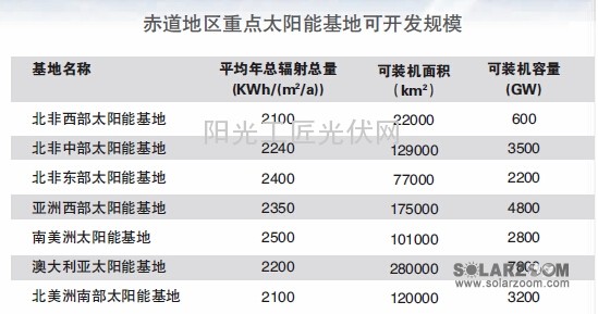 赤道地区的太阳能资源一类地区主要包括北非、东非、南非、西亚、澳大利亚、南美洲西部的广大地区,年辐照强度在2100千瓦˙时/平方米及以上,人口密度低,可利用面积大,开发潜力大,是全球太阳能基地开发的重点地区。赤道重点地区太阳能资源技术可开发量合计约936000TWh/a。