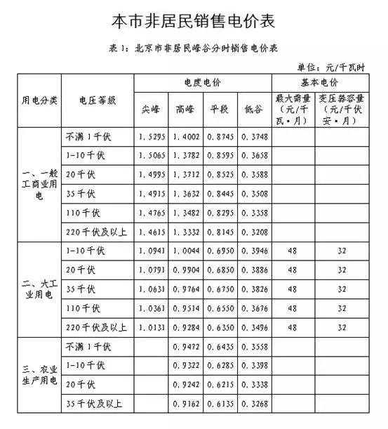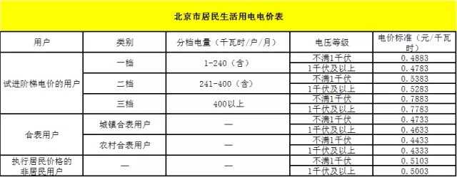 2015年北京市发改委公布的北京市居民生活用电电价表