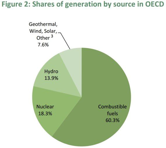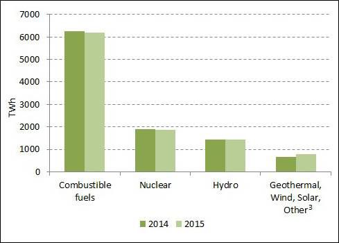 2015年,经合组织可再生能源电力占能源结构比例从2014年的20.6%增长至21.5%,达到776太瓦时,其中风电增长77太瓦时,太阳能光伏增长27太瓦时。易燃燃料电力占60.3%,其中核能发电下降0.5%至1878.9太瓦时。