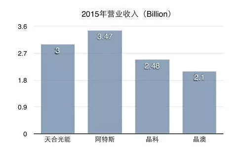 天合光能2015净营收总额为30亿美元,2014年增长32.8%。虽逊于阿特斯,但与自身前年相比,超过30%的增幅不算小。对此,天合在业绩解释增长原因主要得益于生产成本大幅下降,以及海外下游太阳能项目及EPC服务销量上涨。