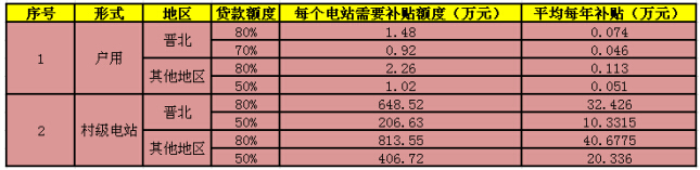 在不贴息的情况下,晋北地区的集中电站在20年内,每年的收入均可以满足扶贫要求,前几年均有不少超出3000元/每位的扶贫结余,进行另行分配;其他地区的集中电站在前4年满足3000元/每位的扶贫要求,其余年份需要稍微补偿。