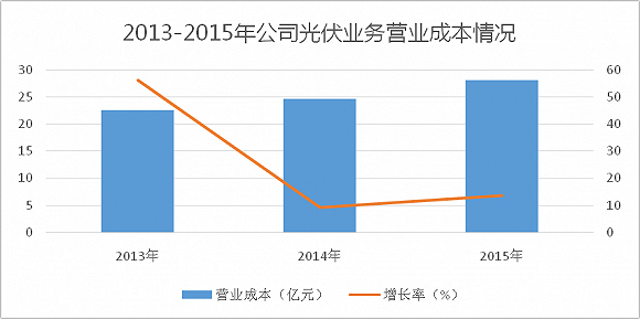 从上图的对比中,不难发现,航天机电光伏业务的毛利率走势对公司产品的综合毛利率影响颇深。纵观其近三年的营业成本,这个“主心骨”业务已陷入成本逐年增加的“泥淖”。在扭亏为盈的2013年,航天机电当年的光伏业务营收额虽然翻倍从而带动公司总营收增至35.59亿元,但该项业务的营业成本却也高达22.51亿元,同比大增56.20%。2014年,公司的光伏业务毛利率因价格提升增长至18.25%,但该业务的成本依旧继续增长了近10%,为24.59亿元。去年,公司光伏业务营收成本的增长率放大至13.53%,达28.08亿元,这便直接造成其毛利率下降至15.41%,并明显拖累了公司净利润的绝对值。对此,广发证券的分析师给出了公司业绩低于预期的风险提示。