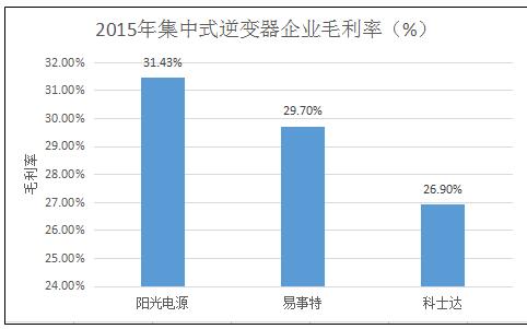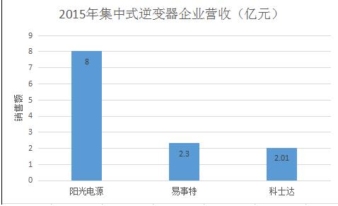 阳光电源依然稳居第一,遥遥领先,而且优势明显。在集中式逆变器市场竞争日益激烈的情况下,其毛利率依然稳定保持在30%以上,销售额同比大幅增长。其2015年销售额约8亿元(注:包含了组串逆变器销售额),同比上升30.05%;毛利率31.43%,同比下降2.89%。