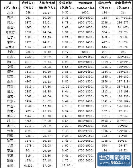 分布式光伏开发潜力。基本思路是:根据国家统计局公布的2012年全国城镇人口和农村人口,按照当年城镇及农村人口人均住房建筑面积,得到全国屋顶总面积,考虑20%的屋顶面积具备安装