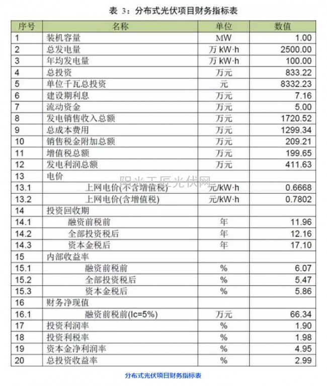 分布式光伏项目可选择三种模式(国家补贴为20年):如果选择“全额上网”方式,对应的光伏标杆电价为0.95元/kWh;如果选择“自发自用,余电上网”,国家给予0.42元/kWh的电价补贴,上网部分按照当地燃煤标杆电价收购;全部“自发自用”,则电价为售电价格、国家电价补贴价格与省级补贴之和。根据江西省电网销售电价表,项目电价采用一般工商业电价:0.7802元/kWh,项目装机容量为1MW,单位造价为8000元。依据以上条件测算,项目融资前税前收益率在6.07%之间,投资回收期超过11年,项目不满足投资要求。具体见下表。如果考虑江西省0.2元的度电补贴,补贴20年,则融资前税前收益率提高到13%,满足投资要求。因此江西省建设分布式光伏项目需要加强资源分析,提高利用小时数,同时根据实际情况由政府给予项目一定的补贴。