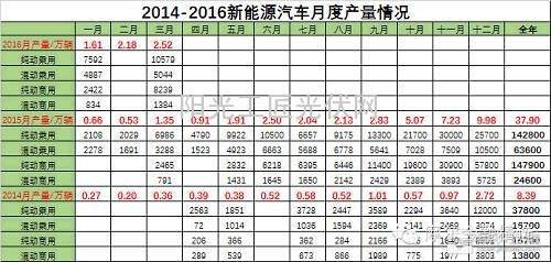 下表统计了2014-2016.3月新能源汽车产量月度数据,今年一季度依然保持了100%以上的增速。