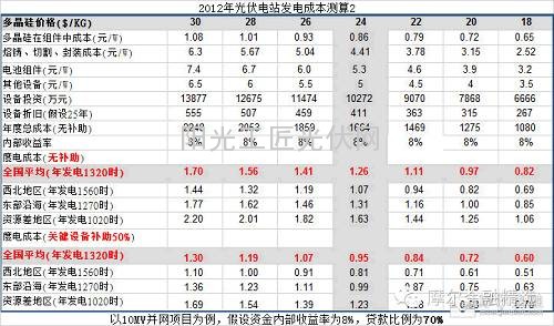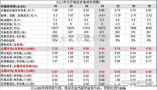 同样是补贴退出,对于行业影响则完全不一样,了解光伏的都知道,光伏起步之初,不考虑补贴,每度电成本3元以上,即使技术进步后的2011-2012年,度电成本也才到1元钱,08-09年补贴政策大幅下滑之时这样的成本是没有竞争力的,只能坐以待毙。下表是本人2012年前后收集整理的光伏发电成本分析,可见只有多晶硅降到20美元以下,加上其他技术进步,才能和其他能源相竞争。