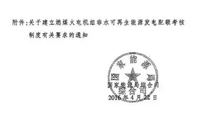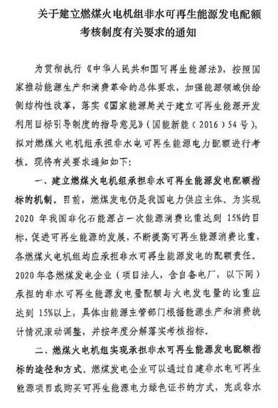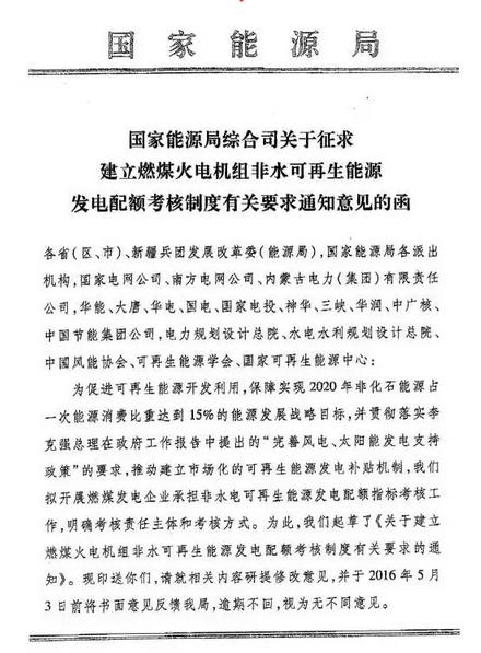 国家能源局关于征求建立燃煤火电机组非水可再生能源发电配额考核制度有关要求通知意见的函