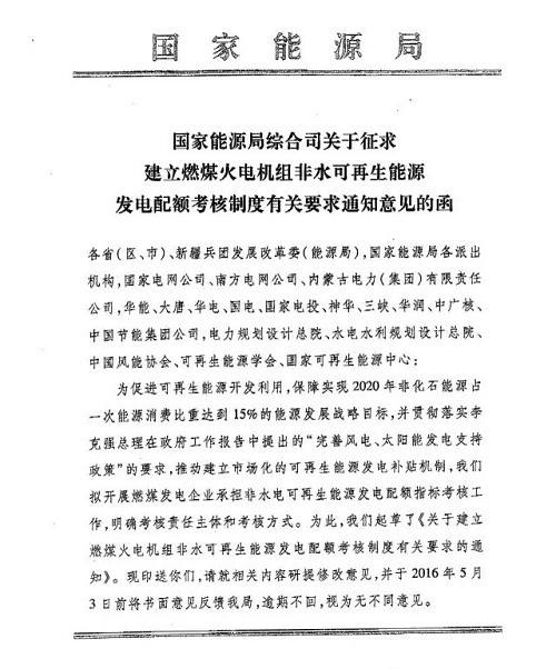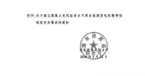 2016年4月22日,国家能源局官发布重要通知,《国家能源局综合司关于征求建立燃煤火电机组非水可再生能源发电配额考核制度有关要求通知意见的函》,文件要求对于未完成非水可再生能源配额要求的燃煤发电企业取消其发电业务许可证。