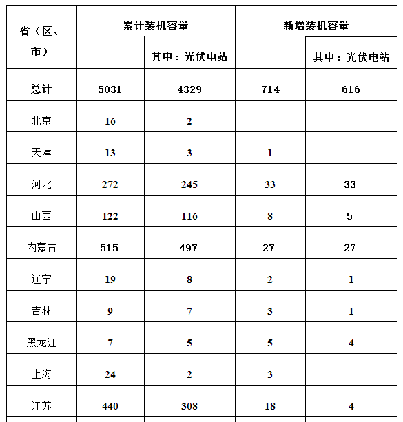 2016年第一季度,全国新增光伏发电装机容量714万千瓦,其中,光伏电站617万千瓦,分布式光伏97万千瓦。累计光伏发电装机容量达到5031万千瓦,同比增加52%,其中,光伏电站4329万千瓦,分布式光伏703万千瓦。一季度光伏发电量118亿千瓦时,同比增加48%。全国弃光限电约19亿千瓦时,主要发生在甘肃、新疆和宁夏,其中,甘肃弃光限电8.4亿千瓦时,弃光率39%;新疆(含兵团)弃光限电7.6亿千瓦时,弃光率52%;宁夏弃光限电2.1亿千瓦时,弃光率20%。