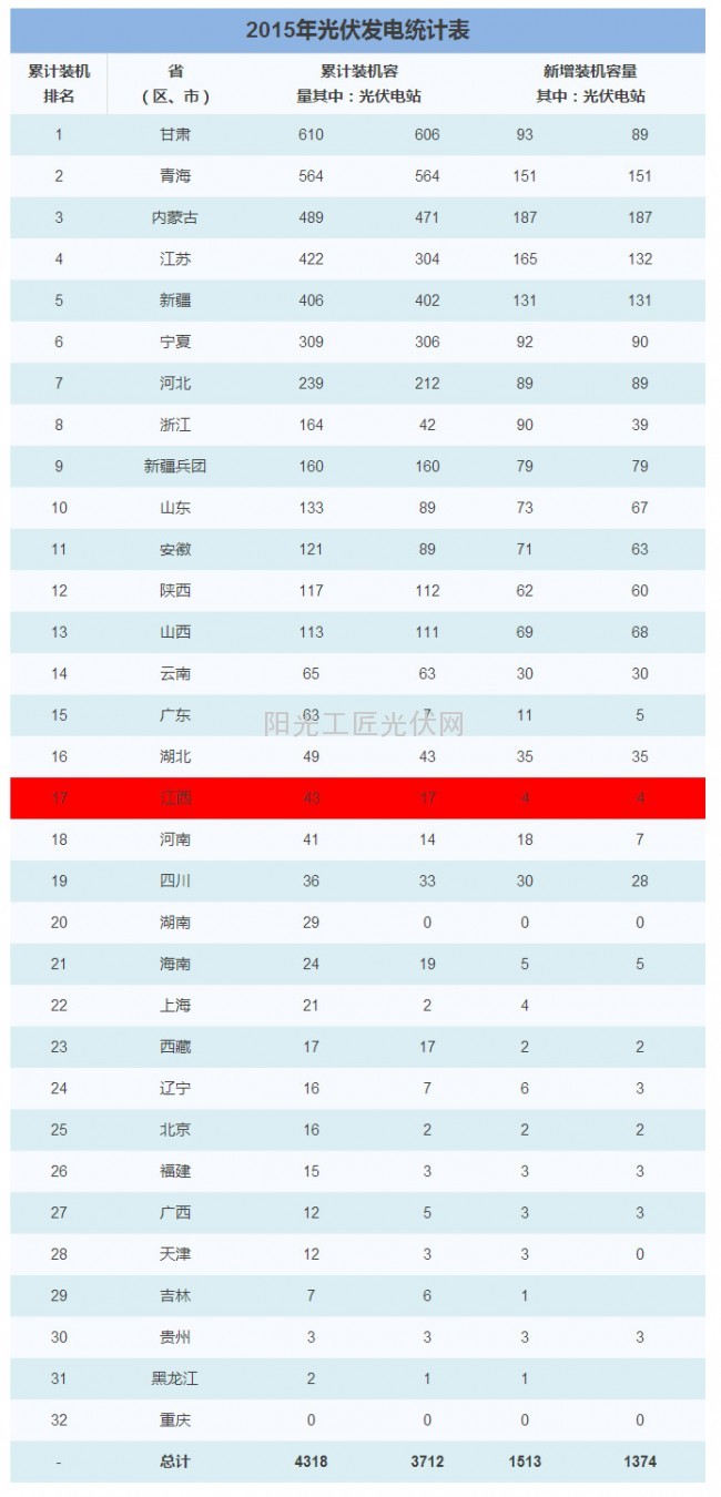 再看一些更新的数据,国家能源局发布的《2015年光伏发电相关统计数据》,截止去年底江西累计装机容量为43万千瓦,其中光伏电站17万千瓦,当年新增装机容量仅4万千瓦。江西的成绩如何?华夏能源网特约作者对2015年各省数据做了排名,江西的实际情况如何大家自己看!