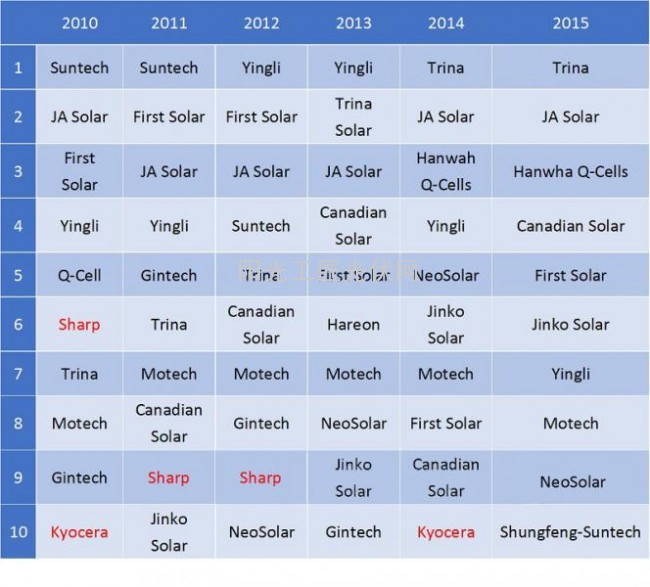2015年的前十名榜单中没有出现日本厂商的名字。在2014年,除了京瓷勉强跻身前十之外,夏普、松下、三菱电机、SolarFrontier等日本厂商也都悉数落榜。