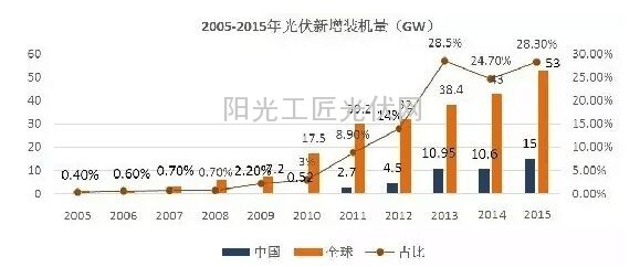 2015年,中国新增光伏装机量15GW,同比增长41.5%,占全球新增装机量53GW的28.3%,连续第三年位居全球新增光伏装机量第一位。