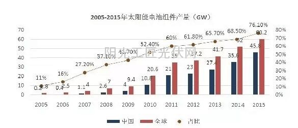 2005年,中国光伏电池组件产量的95%以上出口到海外;2015年,中国光伏电池组件产量的自我消化率已经超过1/3,所谓“两头在外”中的中国光伏电池产品严重依赖国外市场的局面得到大幅度的改善。