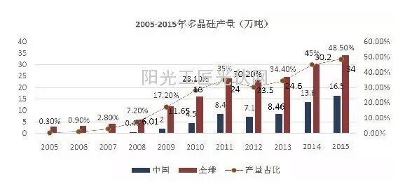 2005年,中国太阳能电池组件产量只有200MW左右,占全球1.8GW产量的11%,仅为日本当年产量的1/4左右,排名位于日本、欧洲之后,最大企业无锡尚德的产能刚刚进入100MW行列;中国多晶硅产量约80吨,仅占当年全球太阳能电池耗硅量2.87万吨的0.3%,中国太阳能电池行业所需的多晶硅95%以上需要通过进口解决,这也正是所谓“两头在外”中的多晶硅供应在外。