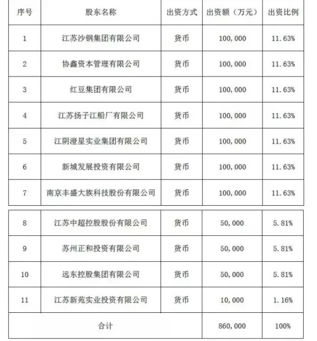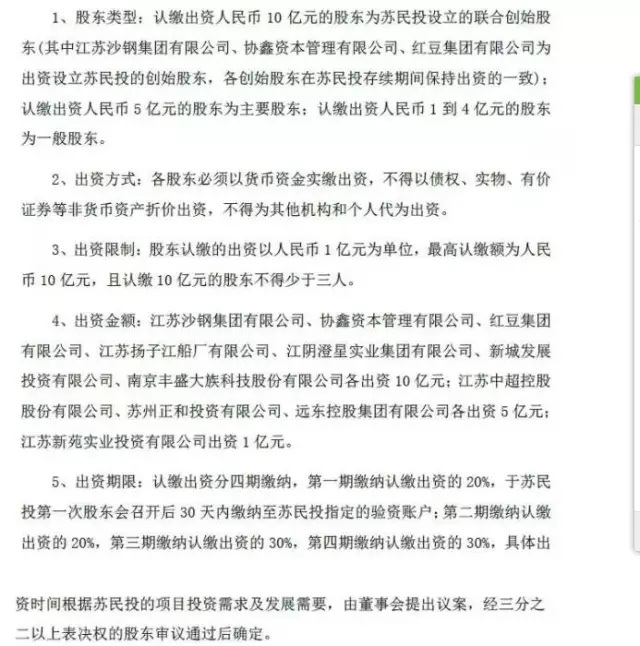 日前,中超控股发布对外投资公告,公司于2016年4月25日与江苏沙钢集团有限公司、协鑫资本管理有限公司、红豆集团有限公司、江苏扬子江船厂有限公司、江阴澄星实业集团有限公司、新城发展投资有限公司、南京丰盛大族科技股份有限公司、江苏中超控股股份有限公司苏州正和投资有限公司、远东控股集团有限公司、江苏新苑实业投资有限公司签订了《江苏民营投资控股有限公司股东协议书》,拟设立江苏民营投资控股有限公司。(具体名称以工商核准为准)。