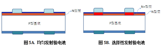 晶体硅电池的扩散层属于掺杂较重的区域,相比于电池的基底区域,少数载流子复合较为严重。降低扩散层的掺杂浓度能够有效降低少数载流子复合,提高电池的开路电压和短路电流。高阻密栅(高扩散方阻、多细栅线数目)技术是目前业内普遍应用的技术手段。高阻密栅技术通过提高电池扩散层的方块电阻,降低扩散层的表面掺杂浓度以及总的掺杂浓度,最终提高开路电压和短路电流。不过由于横向电阻增加以及表面浓度降低,该技术需要牺牲一部分填充因子。选择性发射极技术能够同时兼顾高扩散层方块电阻以及填充因子,该技术在电极区域形成的是重掺杂的N型层,极大降低了与金属电极的接触电阻,有益于改善填充因子,同时在受光区形成的是轻掺杂的N型层,能有效降低N型层的载流子复合,改善短波段的光谱响应,提高开路电压和短路电流。2010左右,该技术在业内曾非常热门,当时与均匀发射极电池相比,转换效率能够提高0.2个百分点左右。近几年由于浆料的性能不断改进,选择性发射极的优势越来越小,个别选择性发射极技术如硅墨技术、激光选择性发射极逐渐被淘汰出局。